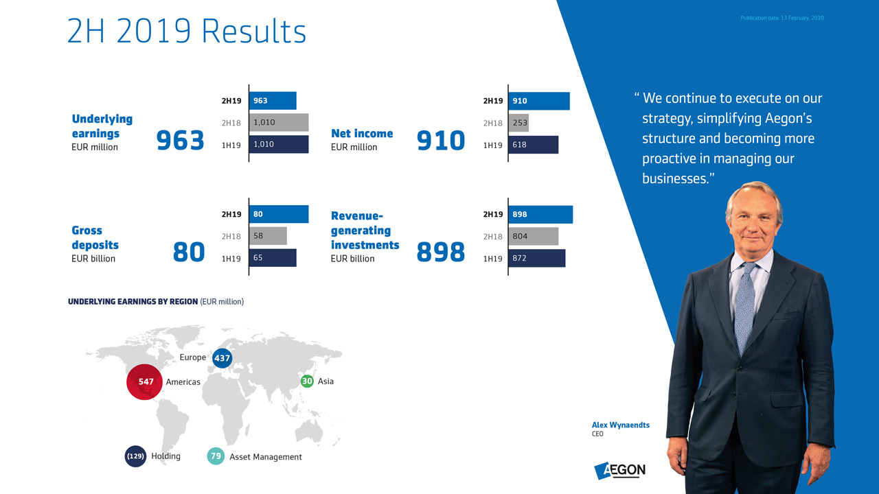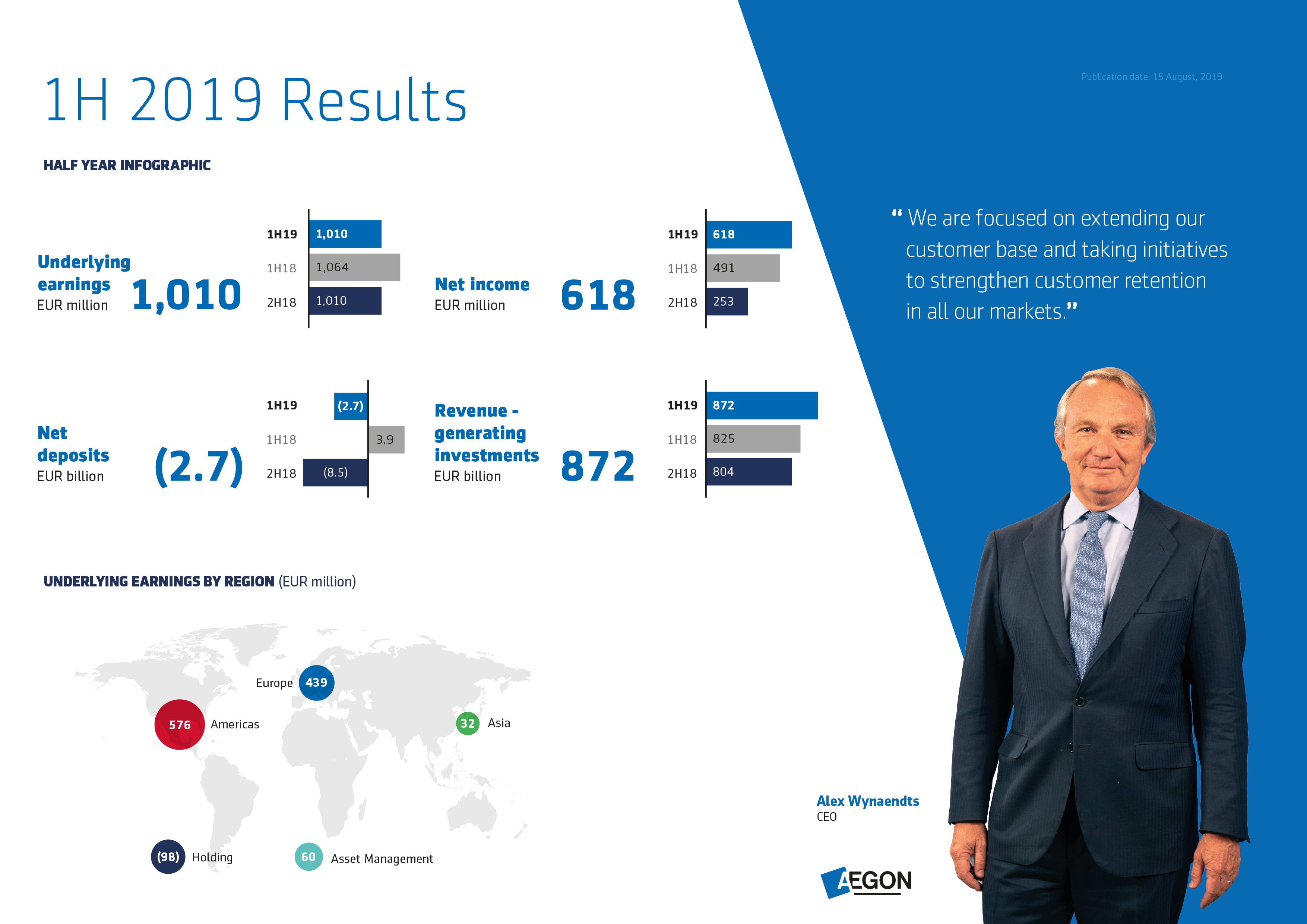 Aegon reports on key performance metrics on a quarterly basis and results under the IFRS accounting framework on a half-yearly basis. This enables us to update core investors and stakeholders more frequently on our performance and progress regarding our commitment to transform Aegon into a more focused, high-performing group.