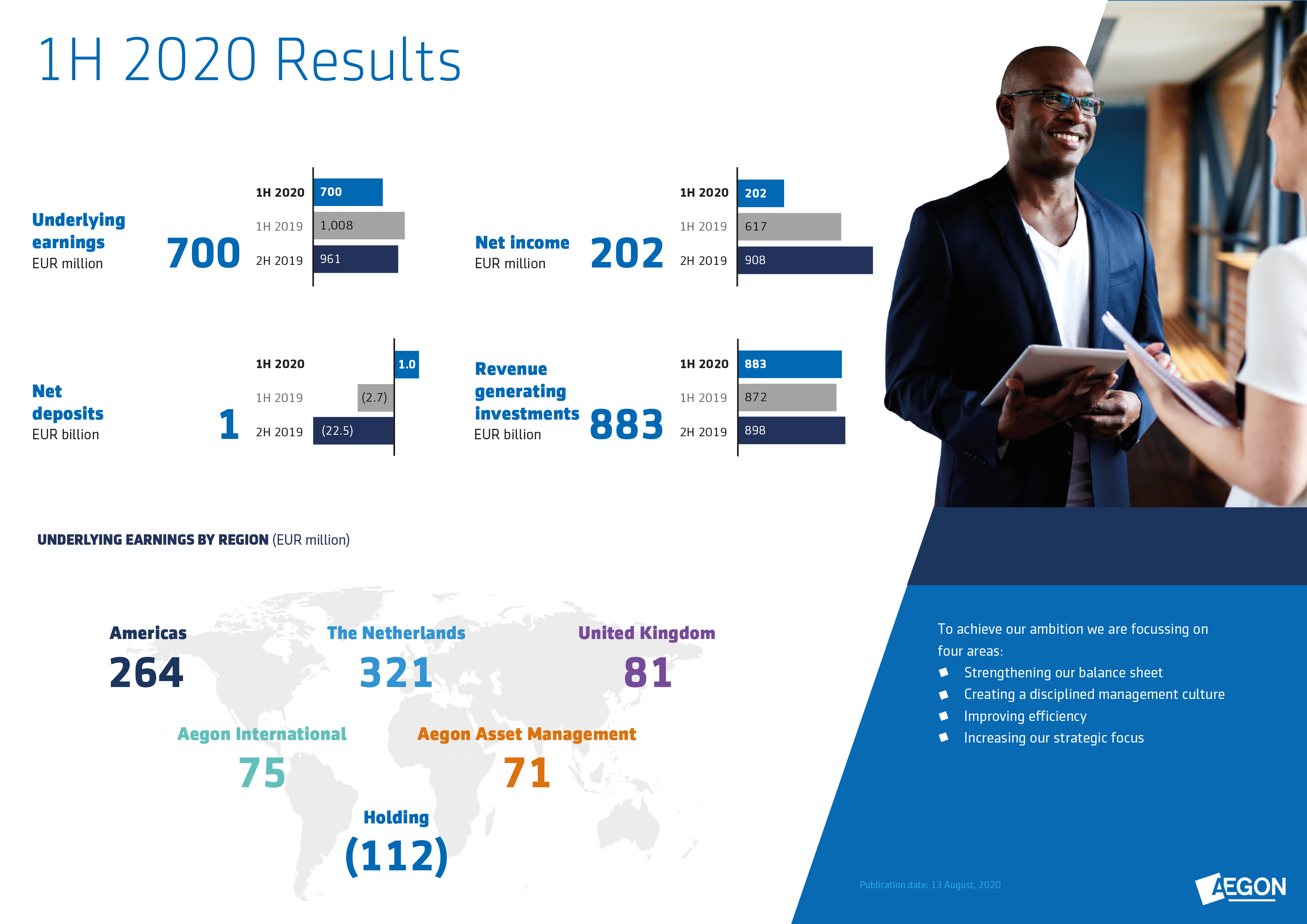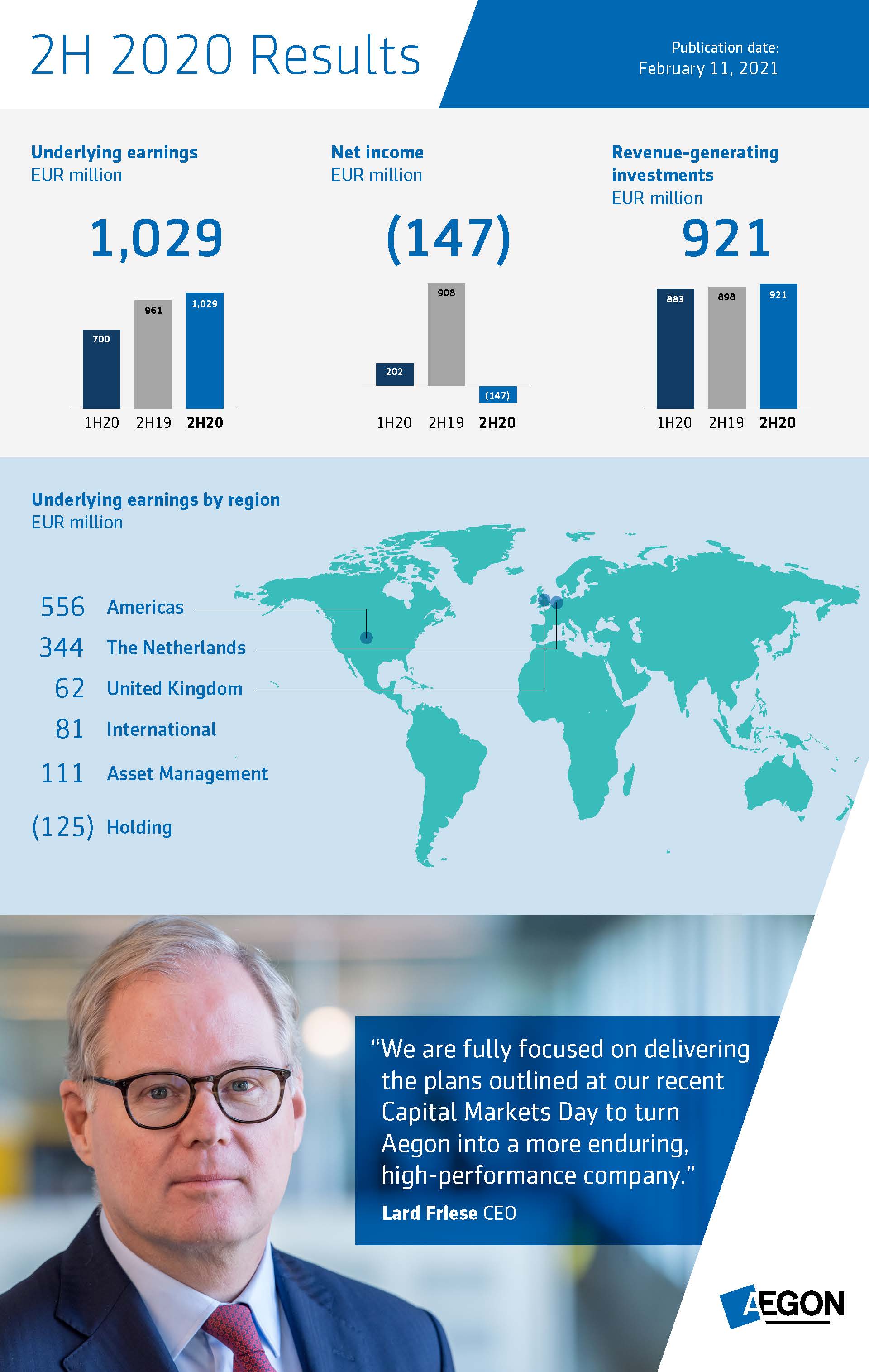 Aegon reports on key performance metrics on a quarterly basis and results under the IFRS accounting framework on a half-yearly basis. This enables us to update core investors and stakeholders more frequently on our performance and progress regarding our commitment to transform Aegon into a more focused, high-performing group.